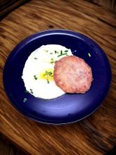 vepřové klobásky s jemnou bramborovou kaší a cibulovou omáčkou
