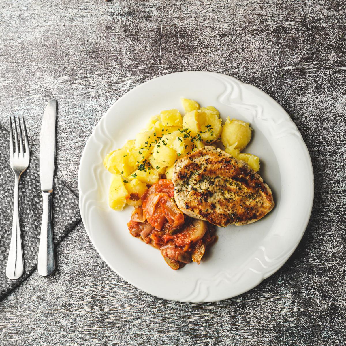 Chicken steak with tomatoes and mozzarella with baked potatoes