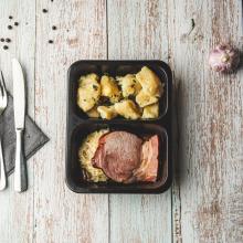 Fried cabbage meatball with smoked meat with boiled potatoes and tartar sauce