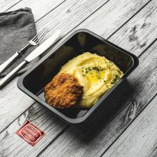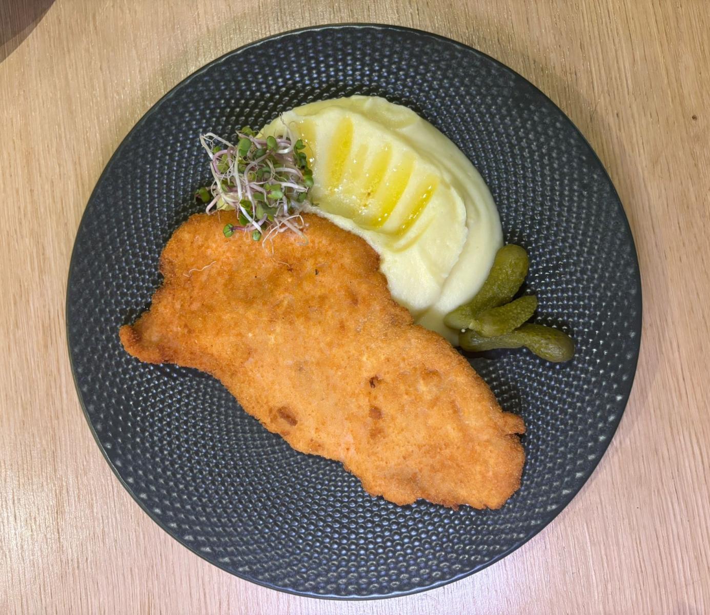 Fried turkey breast with mashed potatoes and pickled vegetables